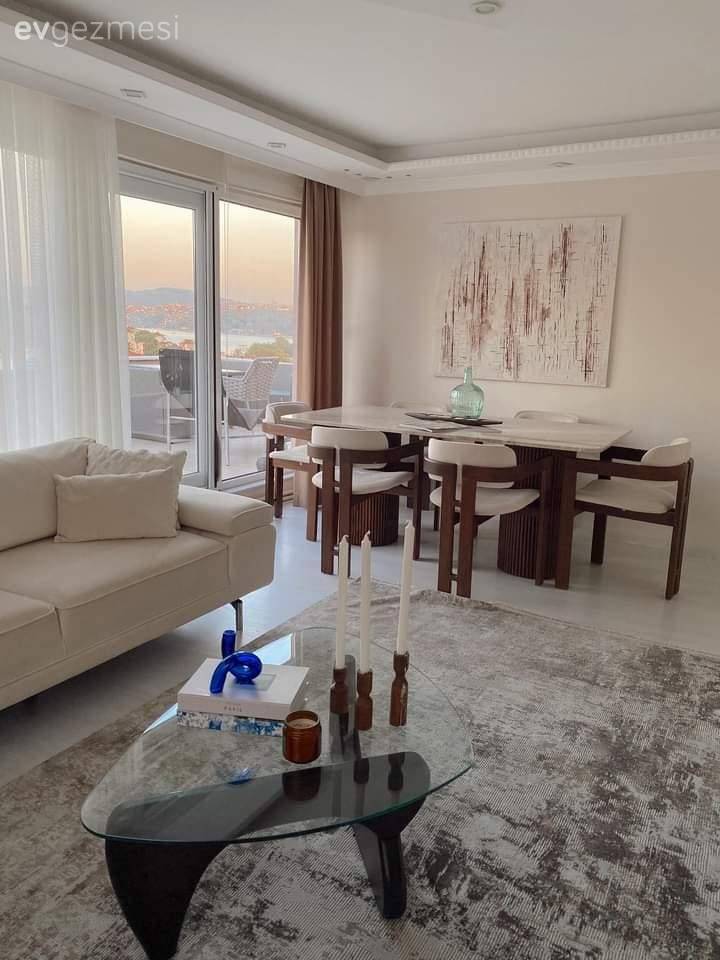 Salonda üç farklı köşe oluşturmaya özen gösteren Hacer Hanım, pencere önünü berjerlere ayırmış. Oturma dışında kalan bölüm ise yemek alanına ayrılmış.