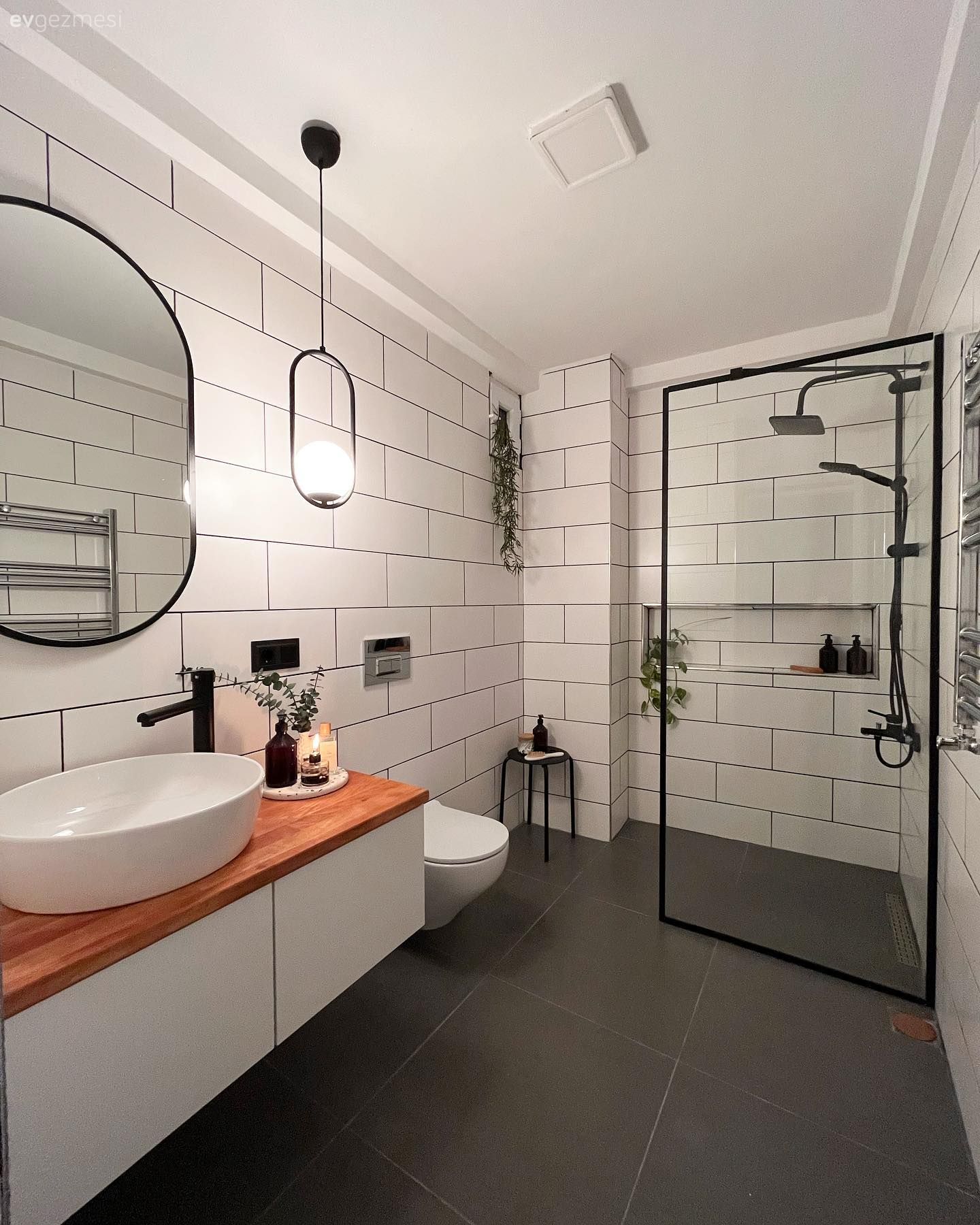 Beyaz ve siyahın buluştuğu banyoda minimal tasarımlar tercih edilmiş. Kontrast renklerin şıklığına lavabo tezgahındaki ahşaplar karışmış.