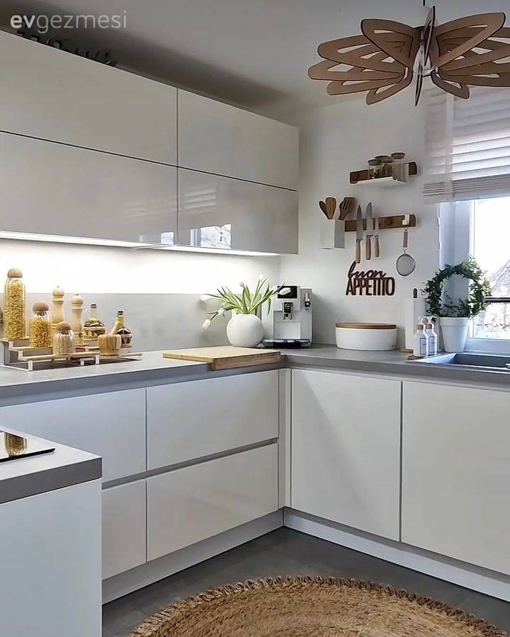 Bu Beyaz Mutfakta L-Tipi Dolaplar Verimli Depolama Sağlamış