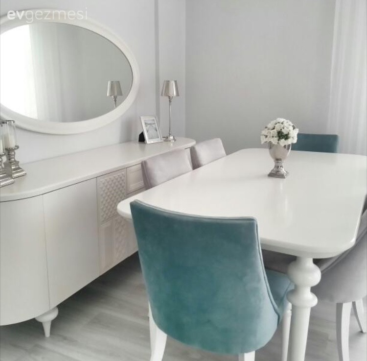 Zemin ve duvar renklerini grinin nüanslarında seçen ev sahibimiz; şamdan, abajur ve dekoratif objelerde grinin en şık hali gümüşü tercih etmiş.. Nötral bu renk paleti ise, yeşil berjer ve sandalyelerle hareket kazanmış.