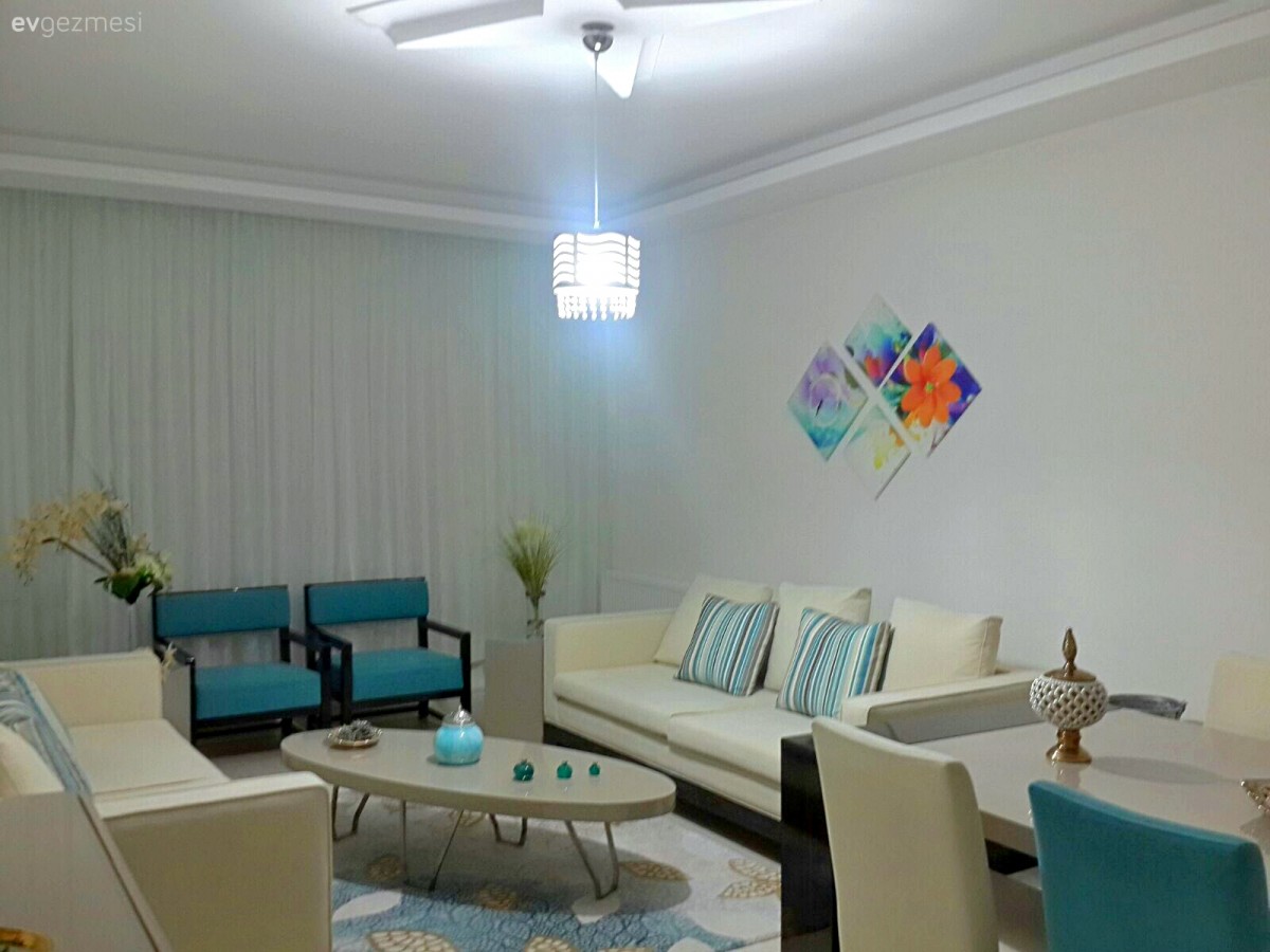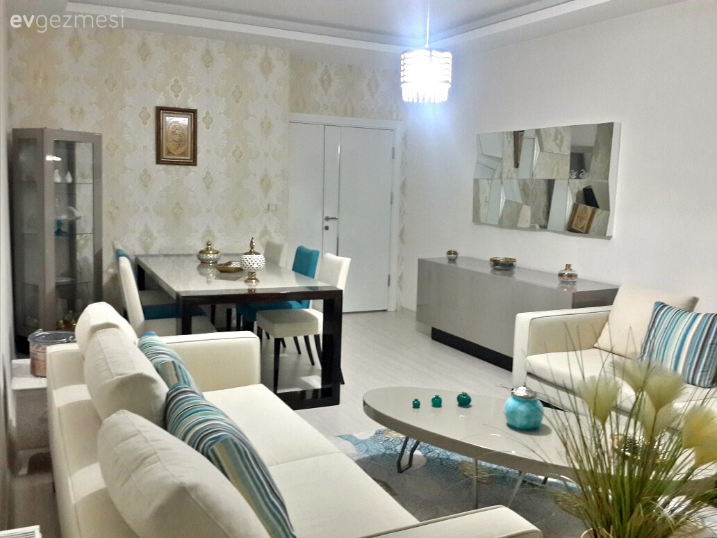 sehpadaki turkuaz objeleri değiştirmeyin. çok hoş duruyor. turkuaz tekli koltuk-sandalye-yastıklarla çok uyumlu.