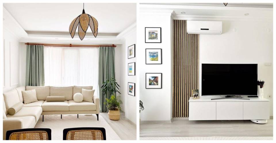Salon, Eklektik, Beyaz, Bej, Krem, Bordo, Köşe koltuk, Koltuk takımı, Tablo, Duvar dekorasyonu, Kırlent, Ev tekstili, Hasır avize, Halı, Salon halısı, Sandalye, Yemek masası, Ev bitkisi, Ahşap Mobilya