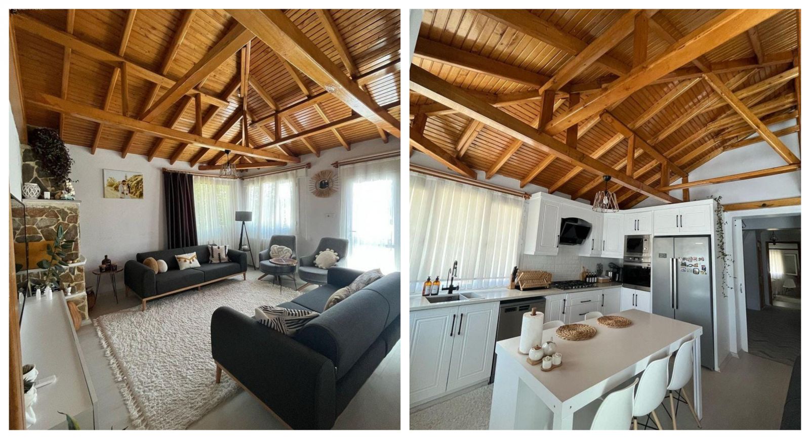 Tavanda da yer alan ahşaplar sayesinde ortam daha samimi görünmüş. Tavanların yüksekliği de ferahlığa katkı!