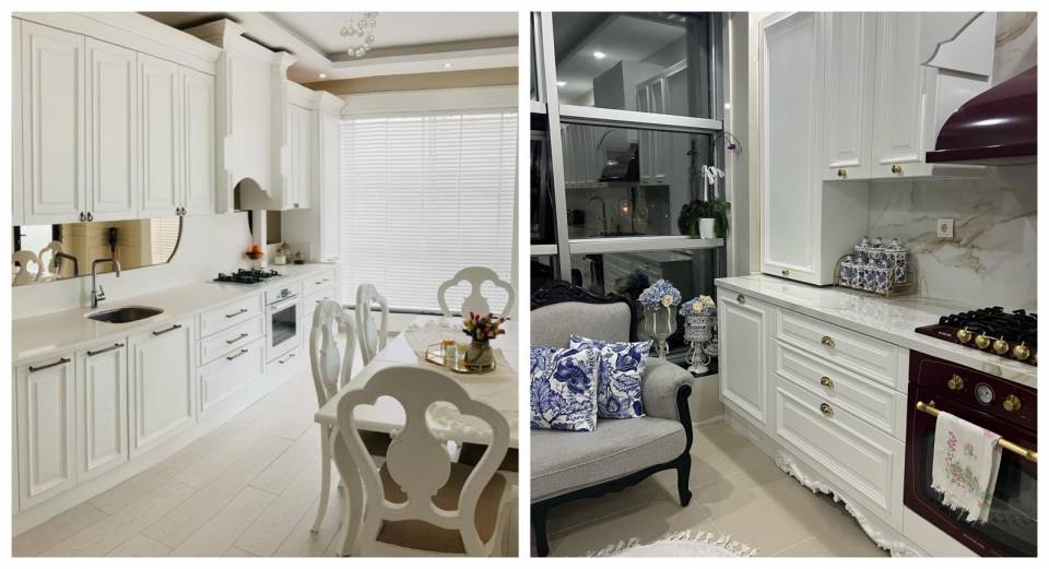 Amerikan mutfağı da olan açık konsept salonda, mutfak bölümünde beyaz baskın olmuş. L tipi tasarlanan beyaz dolaplar, merkezde ada ile tamamlanmış.