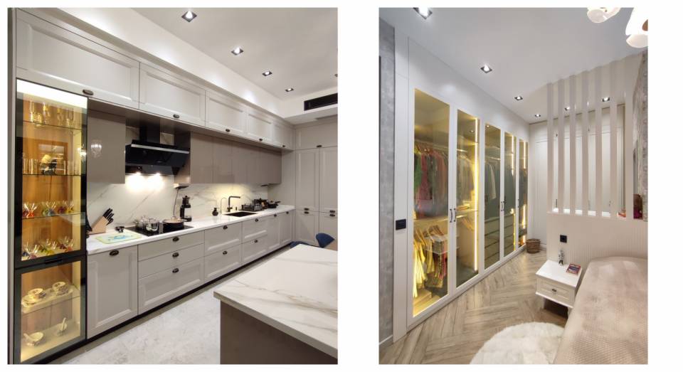 Mutfakta da kullanılan beyaz renk, ahşap tezgah ile sıcaklık kazanmış. Aynı görünüm banyoda da devam ettirilmiş.