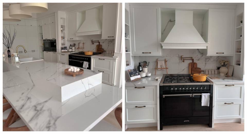 Mutfağın modern tavrını yansıtan porselen tezgah, tezgah arasına kadar uzamış. Böylece alanda akıcı görünüm oluşmuş. Köşe dolabının tasarımı da ekstra bir dokunuş olmuş!