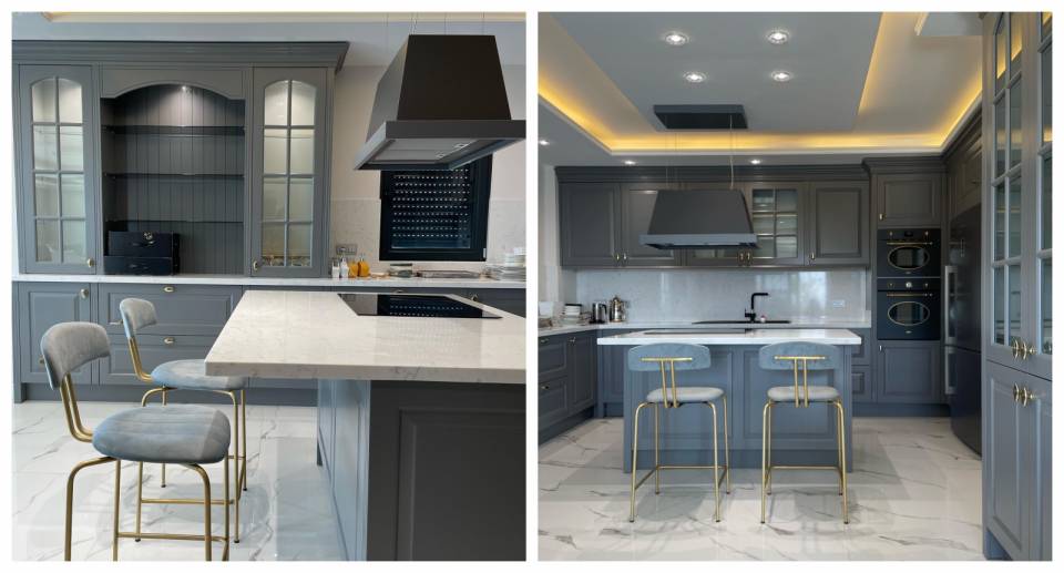 Mutfak, Ahşap mutfak, Beyaz ve ahşap mutfak, L-tipi mutfak, Mutfak tezgahı, Mutfak tezgah arası, Sandalye, Mutfak masası, Mutfak halısı