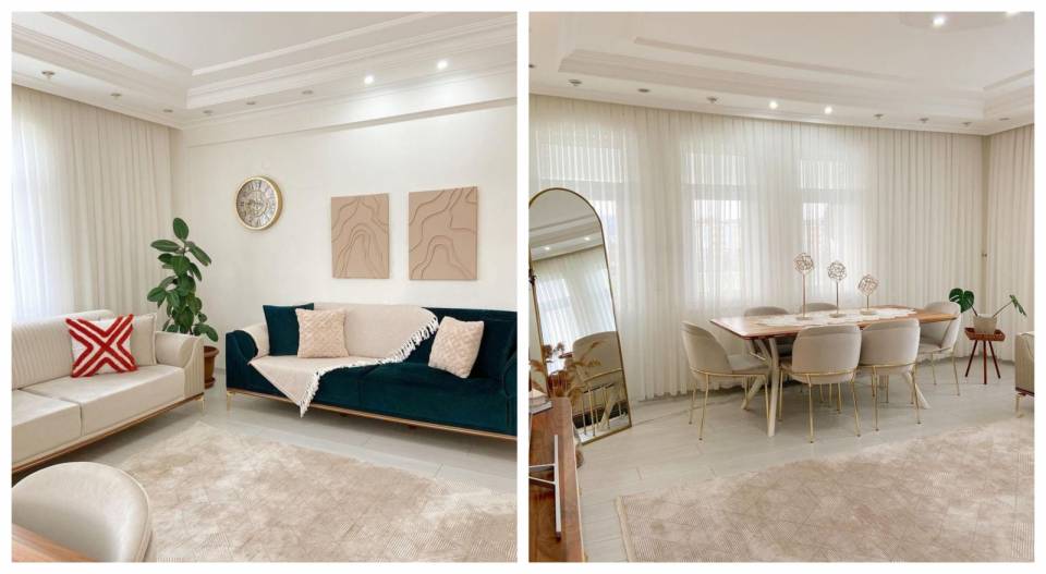 Mutfak, Beyaz, Beyaz mutfak, Bej, Krem, Mutfak tezgahı, Mutfak tezgah arası, Tezgah arası seramik, Mutfak aksesuarları, Sandalye, Yemek masası, Mutfak perdesi