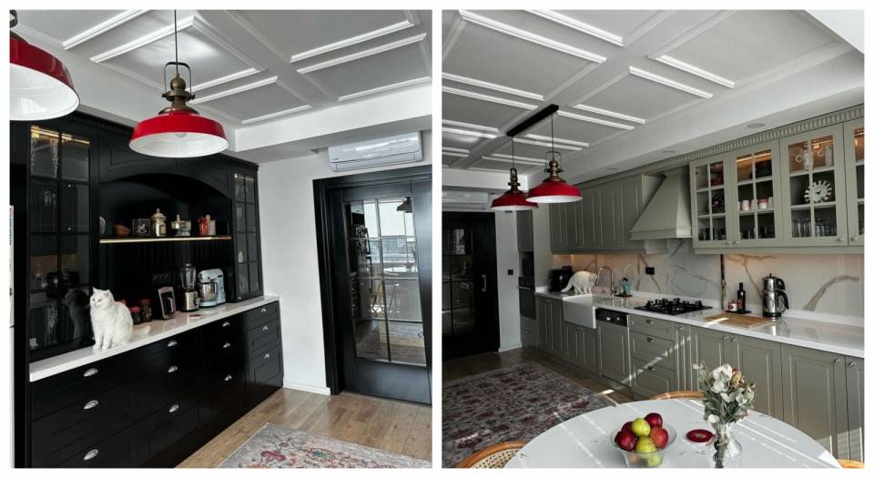 L tipi tasarımın uygulandığı mutfakta, beyaz shaker kapaklar kullanılmış. Siyah tezgah arası ve tezgahla da kontrast sağlanmış.