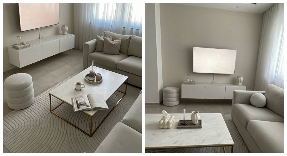 Salonda geniş alanları bej gibi açık tonlar süslemiş. Tamamlayıcılar söz konusu olduğunda da siyah el sallamış.