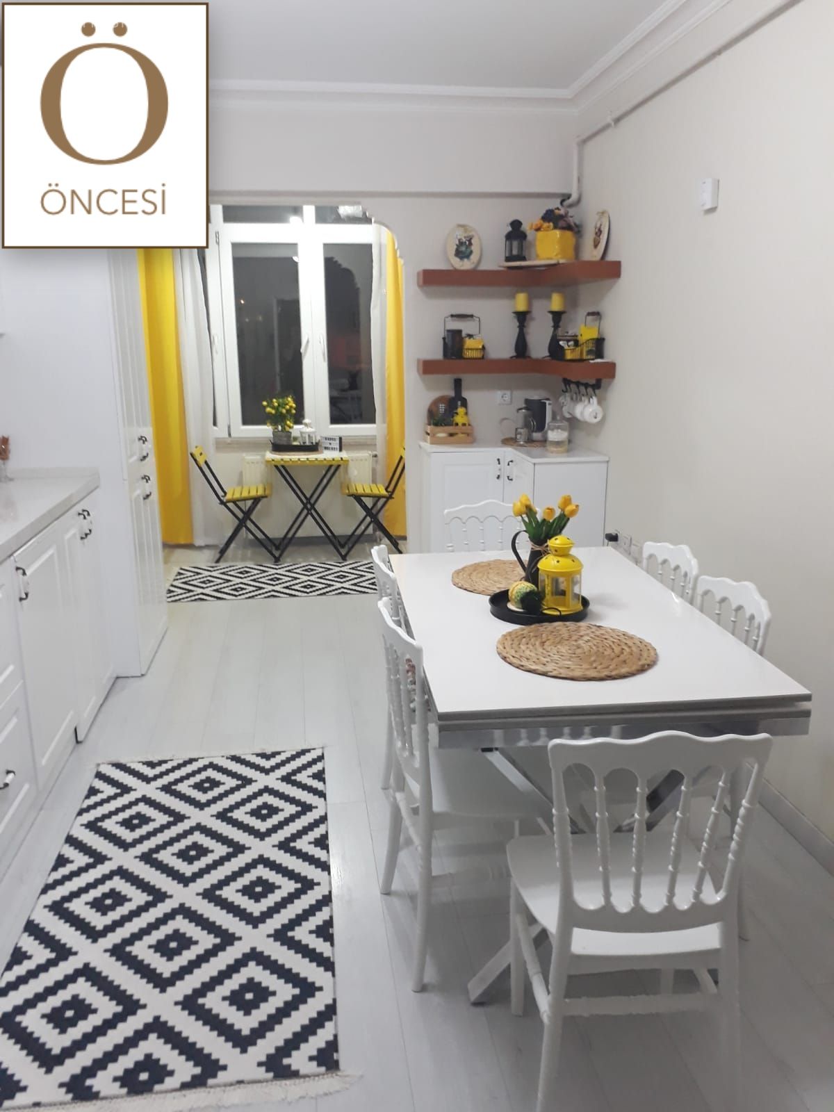 Alternatif tezgah alanı sağladıktan sonra masa ve sandalyelerini de değiştirmiş: Eski halinde countrye yakın olan mobilyaların yerini ahşabın baskın olduğu parçalar almış.