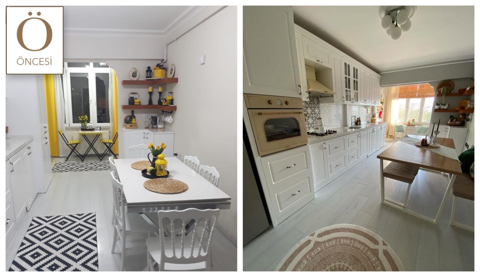 Balkon ve mutfağın kesişim noktasında duran uzun dolabı kaldırmış. Oradan kazandığı alana da tezgahı uzatmış.