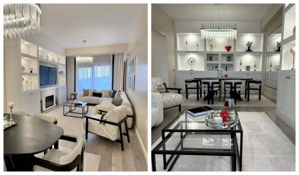 Alanı ferah göstermek istiyormuş diye renklerden beyazı baskın tutmuş. Beyazla karışan siyahı da sevince kontrast hava hakim olmuş.