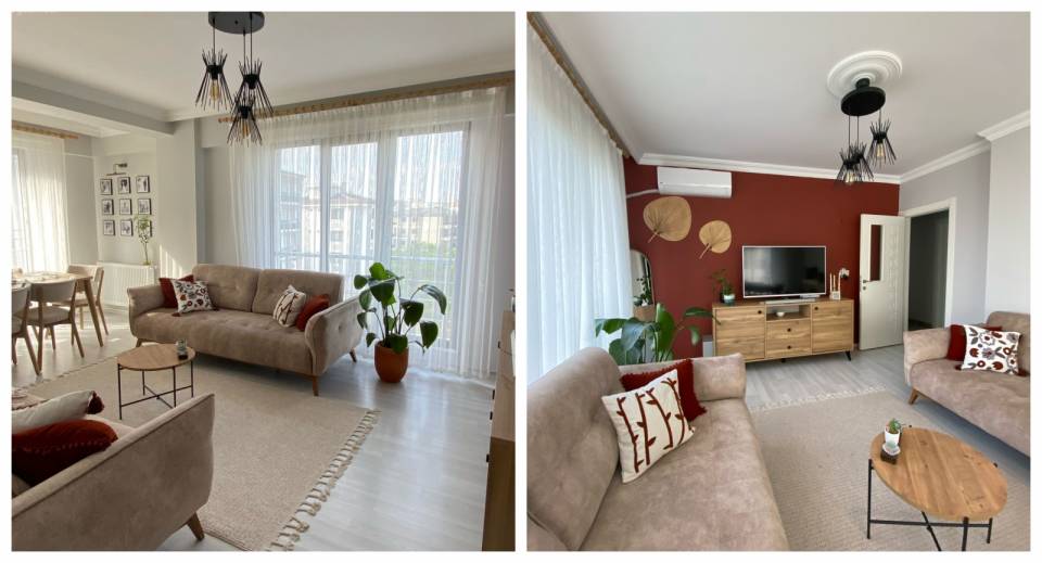 Ferah ve sıcak bir dekor isteyen ev sahibimiz, salonunda yaptırdığı mobilyaları sergilemiş. Pencereye yakın taraf masa ve sandalyeye ayrılmış. Devamında da konforlu köşe koltuk kullanılmış.