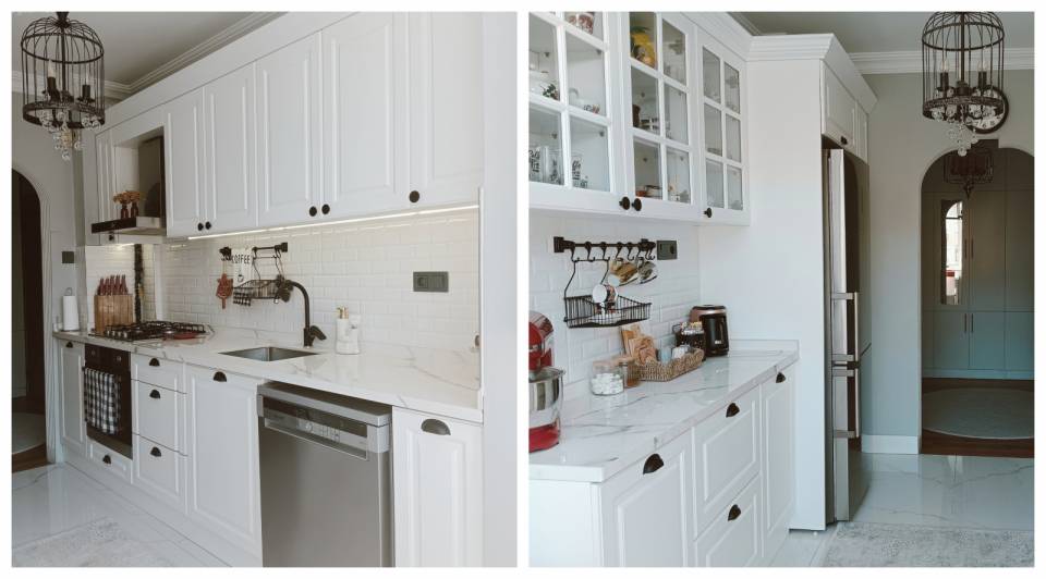 Dolapların olduğu bölümde akıcı bir tavır istemiş Yasemin Hanım! Bunun için de hem tezgahta hem de tezgah arasında beyazı kullanmış.