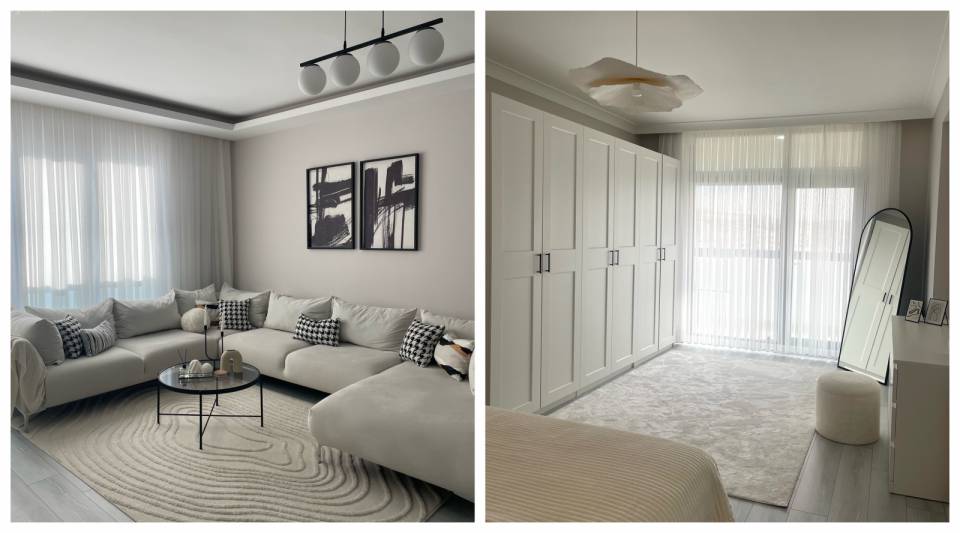 Minimal çizgilere sahip mobilyalar tercih eden ev sahibimiz, renk dengesinde açık tonlara ağırlık vermiş. Siyahla da kontrast etkisini sağlamış.