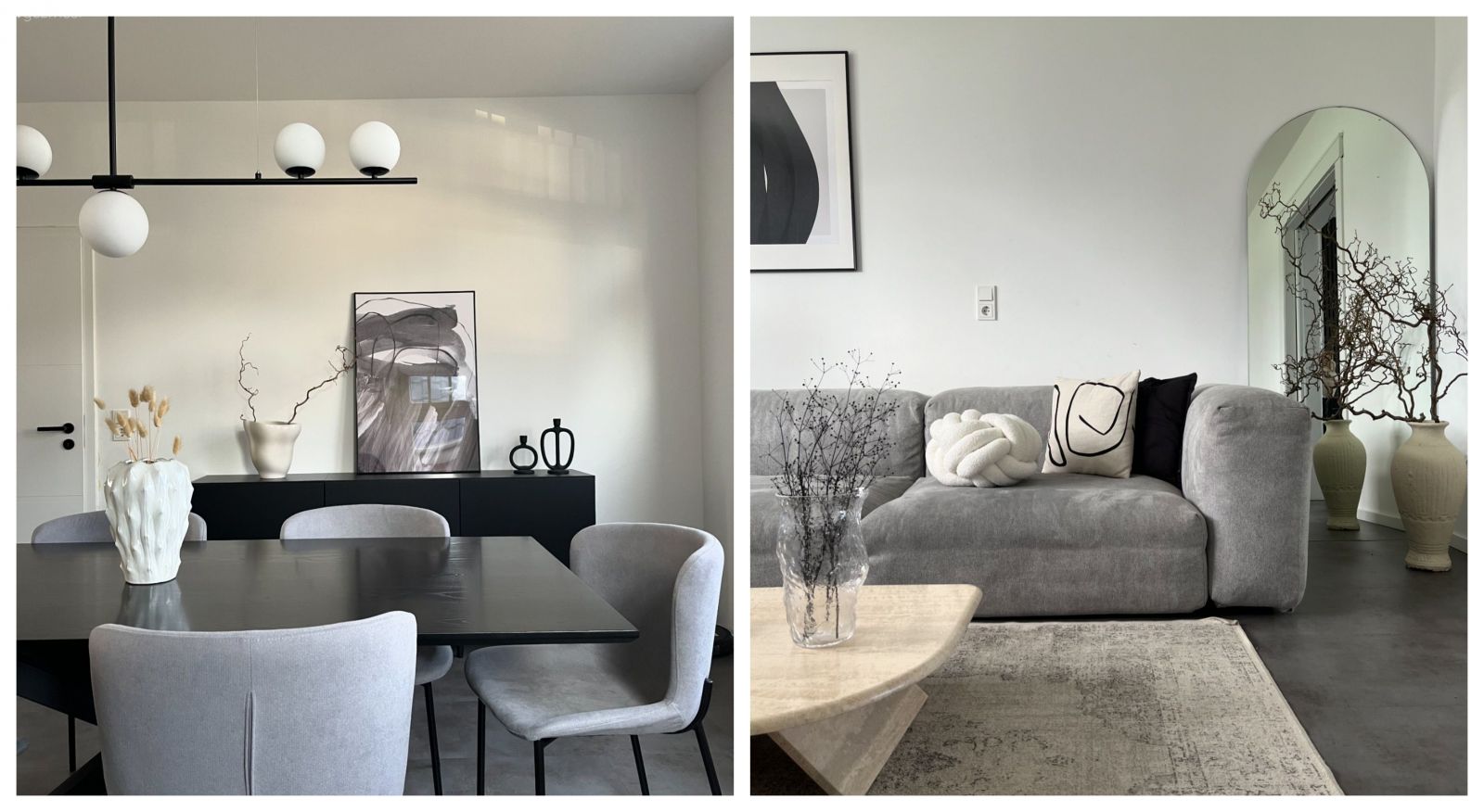 Gri rengin baskın olduğu dekorda, griye eşlik eden diğer tonlar nötr olmuş. Geçişler için de beyaz kullanılmış.