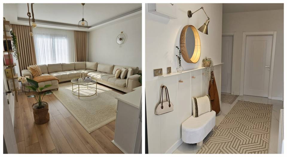 Sonra bu temel parçaları tamamlamaya başlamış: Zemine otantik bir halı almış. Köşeye de ahşap bir büfe koymuş.