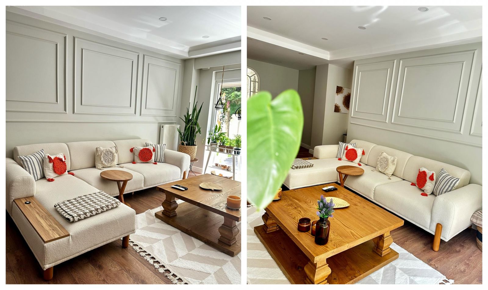 Açık renkleri ahşap ile dengelemeyi seviyormuş kendisi. Bu yüzden köşe koltuğun rengi beyaz olmuş.