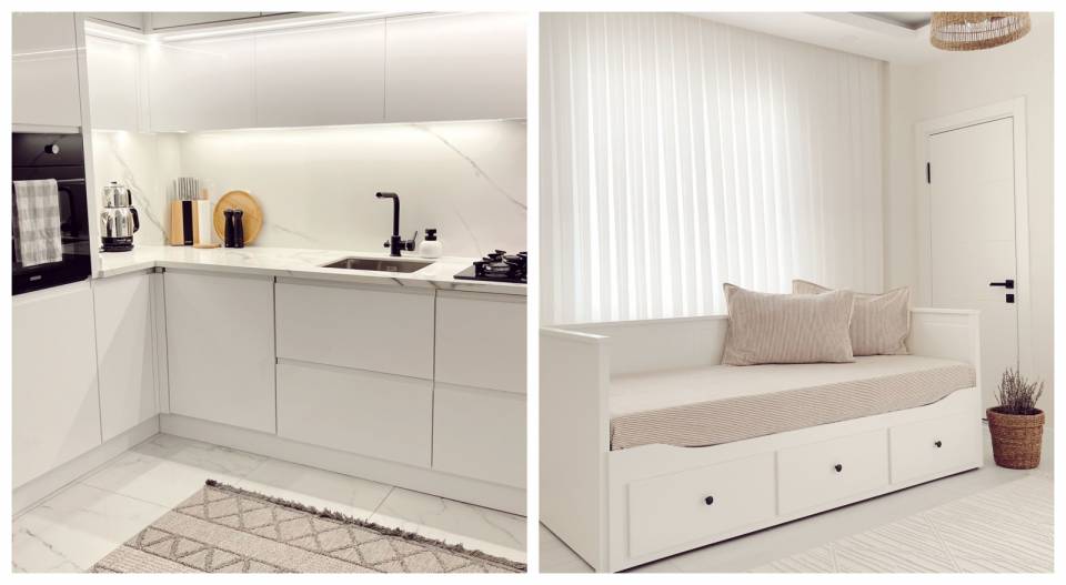 Mutfağın karamsar halinden kurtulmak için dolapları hemen beyaza boyamış ev sahibimiz! Tezgah ve tezgah arasını da folyo ile kaplamış.