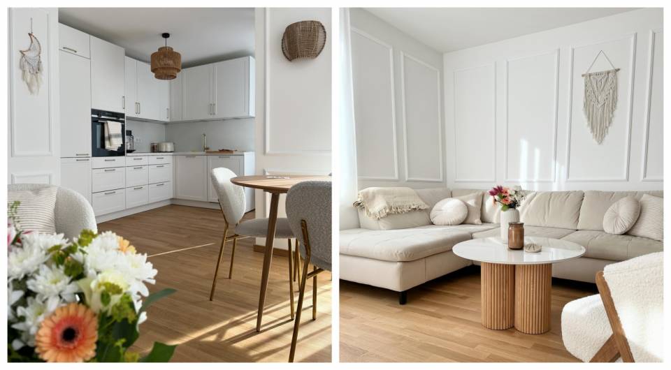 Salon, İskandinav, Beyaz, Ahşap Mobilya, Sandalye, Yemek masası, Koltuk takımı, Halı, Salon halısı, Avize, Aydınlatma, Salon avizesi, Dekoratif Objeler, Parke, Tavan vantilatörü