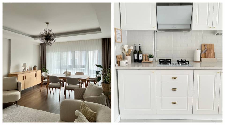 Mavi köşe koltuğu diğer tarafa alan Emine Hanım, bu defa alandaki nötr ve açık ton etkisini arttırmış. Hasır sıcaklığı ile dengeyi sağlama koşuluyla...