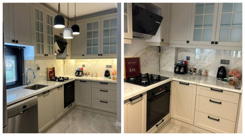 Mutfak dolaplarında beyaz renk seçildiği için alan yeteri kadar aydınlıkmış. Beyaza eşlik eden altın yansımalar da ayrıksı noktaları oluşturmuş!