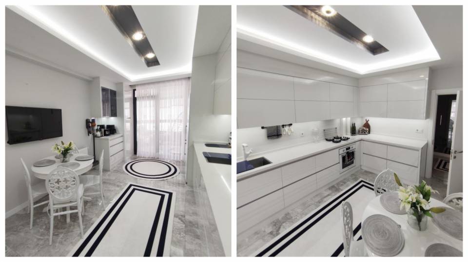 Köşe koltuk, Koltuk takımı, Antrasit  , Beyaz, Tül perde, Perde, Halı, Salon halısı, Avize, Aydınlatma