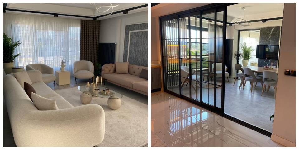 Tercih edilen koltuk takımının tasarımı modern olsa da ortamın genel aurası klasik stile göz kırpmış. Bunda perde ve taşlı avizenin etkisi oldukça fazlaymış!