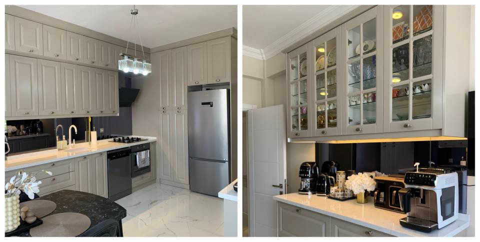 Mutfak, Beyaz, Klasik, Altın, Shaker kapaklı dolaplar, Mutfak tezgahı, Mutfak tezgah arası, Porselen tezgah, Mutfak aksesuarları, Mutfak perdesi, Ekstra mutfak dolabı, Mutfak halısı, Mutfak Avize Modelleri, Mutfak tülü