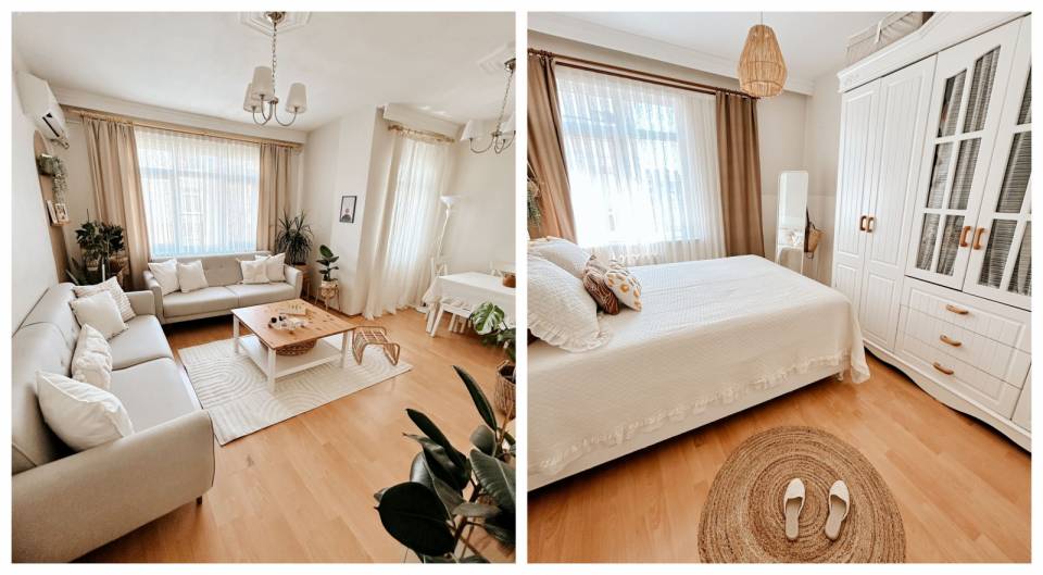 140 m2 yaşam alanı olan bu evin iki cephesinde de geniş balkonlar yer almış. Evin giriş katında da varanda alanı kapatılarak kış bahçesine dönüştürülmüş.