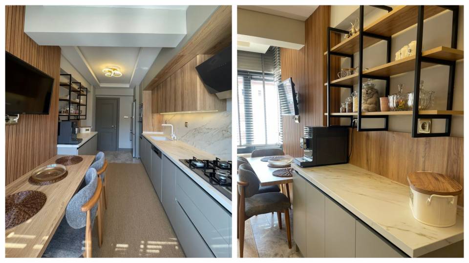Salona dikey konumda planan bu açık mutfakta aradaki kısım yemek alanı olarak değerlendirilmiş.