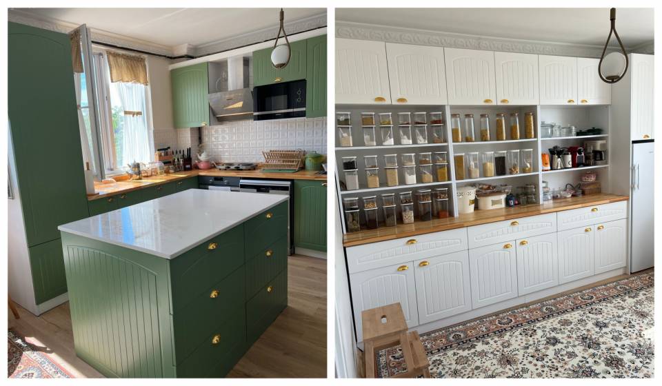 Beyaz dolapların ve rustik ankastrelerin kullanıldığı mutfakta taşlı avizeye yer verilmiş. Yani bu bölüm de klasik tarzı bu şekilde yansıtmış!