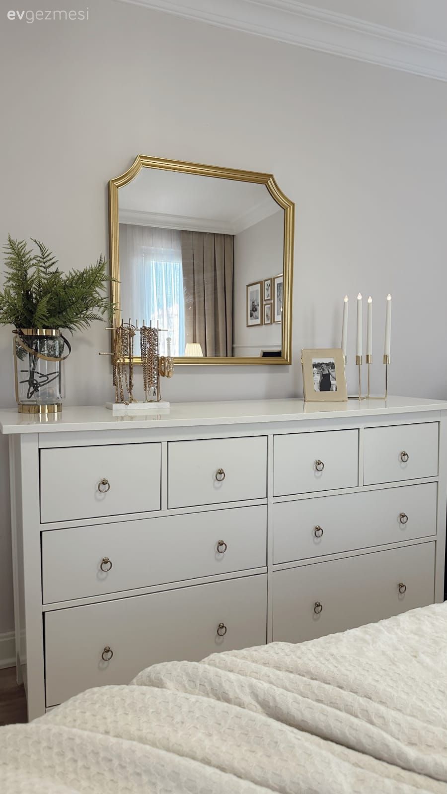 Dekorasyonda aksesuarların etkisini çok iyi bilen ev sahibimiz, altın detaylı ayna ve taşlı avizeler ile bu bilgisini pratiğe dökmüş.
