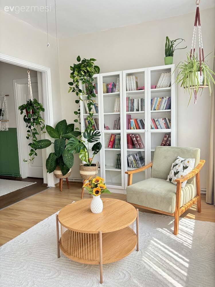 Beyaz, Krem, Bej, Ev bitkisi, Ahşap Mobilya, Jüt halı, Halı