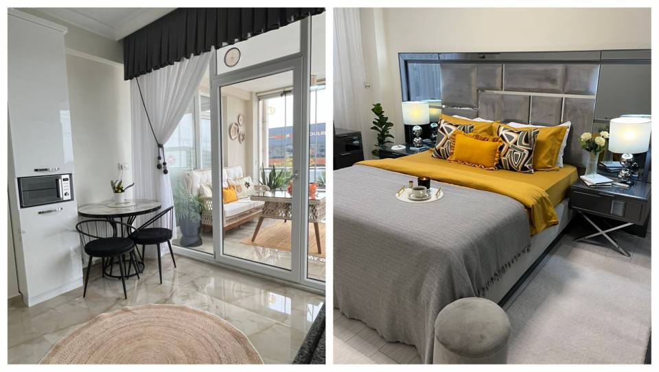Mobilyalarla pekiştirilen modern tarzda dekora samimiyet katmak için keskin hatlı mobilyalardan uzak durulmuş. Bunun yerine kıvrımlı hatlar ve teddy kumaşlar öne çıkmış.