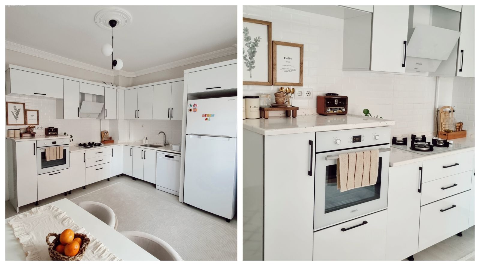 Mutfağı biraz daha hareketlendirmek isteyen ev sahibimiz, tezgah arasına çerçeveler asmış. Birkaç aksesuar daha kullanarak son dokunuşlarını yapmış.
