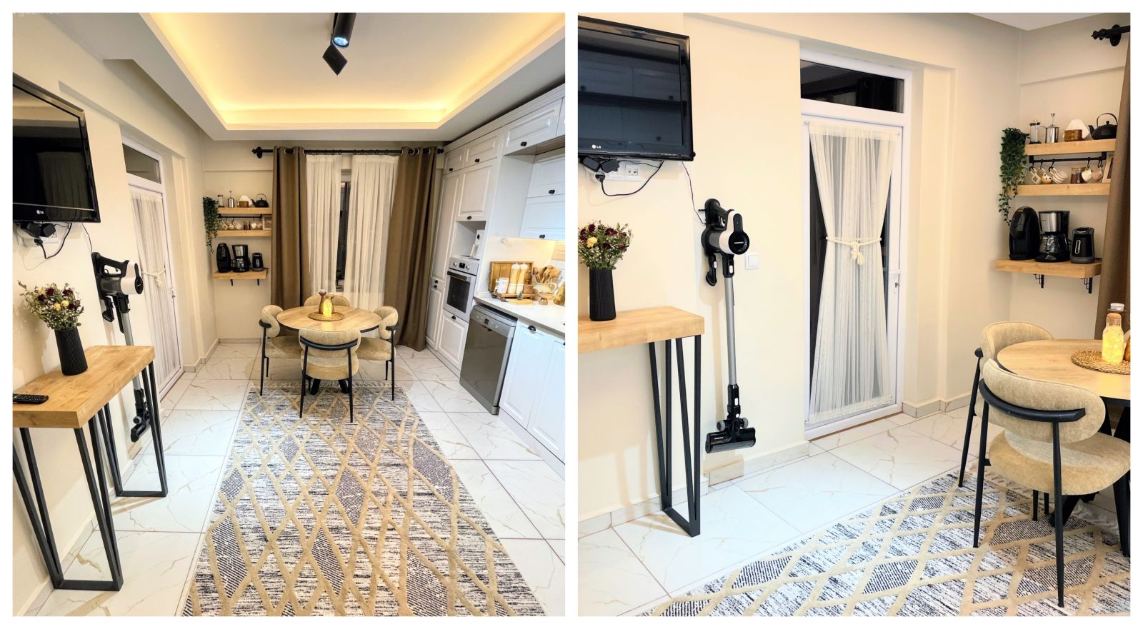 Teddy kumaş ile birlikte mutfağı hem modern dokunuş kazanmış hem de sıcaklık! Sıcaklık demişken tv altındaki tel büfenin yerini de ahşap dresuar almış.