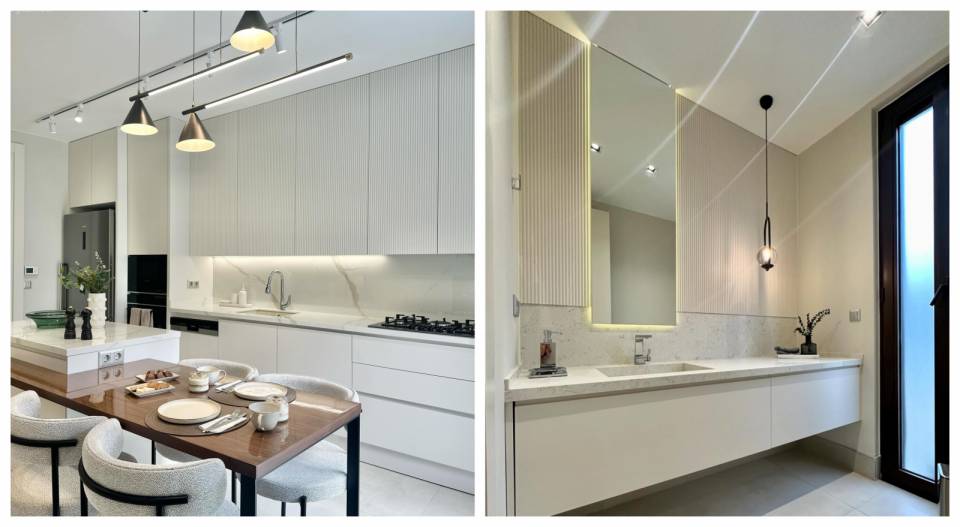 Mutfağı da küçük olan bu evde, bu bölümü ferahlatmak için beyaz renkli dolaplara başvurulmuş.