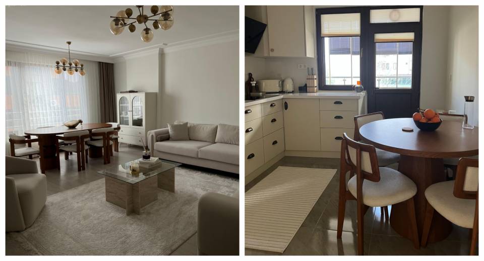 Salon, Yemek Odası, Beyaz, Krem, Kahverengi, Sandalye, Yemek masası, Halı, Salon halısı, Cam orta sehpa, Orta sehpa, Tv ünitesi, Tv ünitesi aksesuarları, Ev Aksesuar, Vazo, Pampas otu, Fon perde, Perde, Tül perde