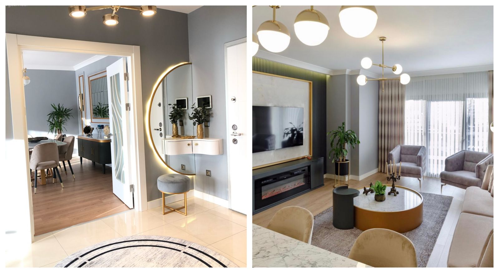 İlk olarak karşımıza çıkan salonda mobilyalar ve renk paleti modern stili öne çıkarmış. Tamamlayıcı öğeler ise art dekonun sesini duyurmuş.