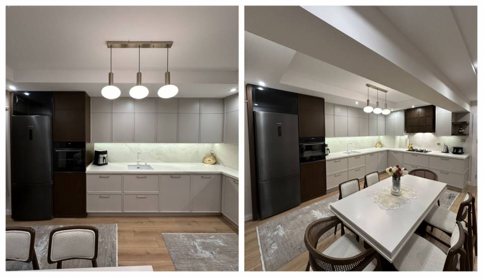 Salon çok geniş olmadığı için köşe koltuğun hemen devamına masa ve sandalye yerleştirilmiş.