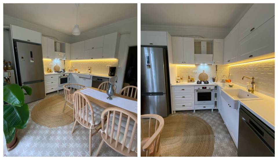 Açık konsept yaşam alanının mutfak bölümü tasarımıyla modern kalmış. Onun devamında yer alan salon ise tam olarak nostaljik!