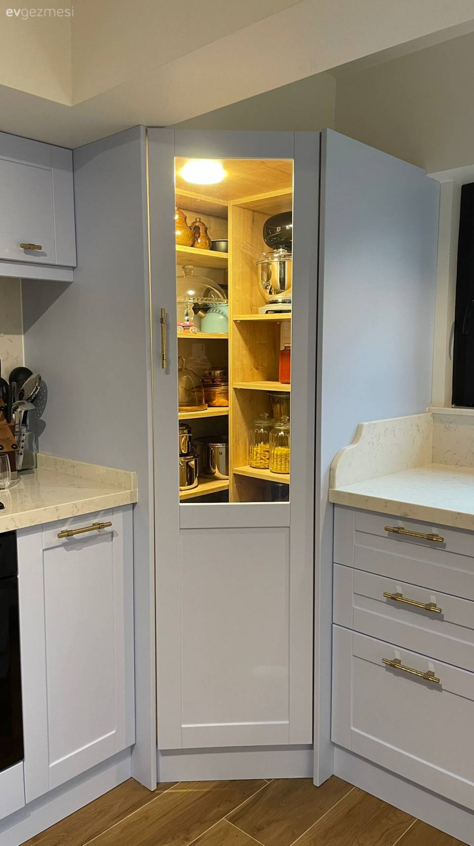 Evin mutfağı beyaz dolaplardan oluşmuş. Beyazın yanına ahşaplar da gelince keyfini bir şey bozamamış.