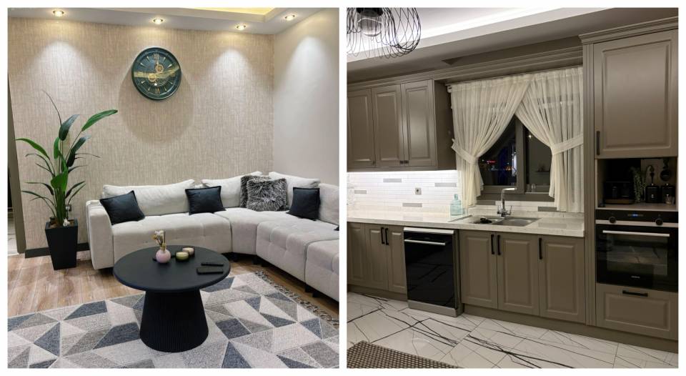 Açık konsept yaşam alanının olduğu evde salonun hemen arka kısmı mutfağa ait. Doğrusal şekilde uzanan bu alanda, mutfak ile balkon arasında bir duvar bulunuyor. Ev sahiplerimiz bütün alanlar arasında bağlantı kurmak için yarım servis penceresi oluşturmuş.