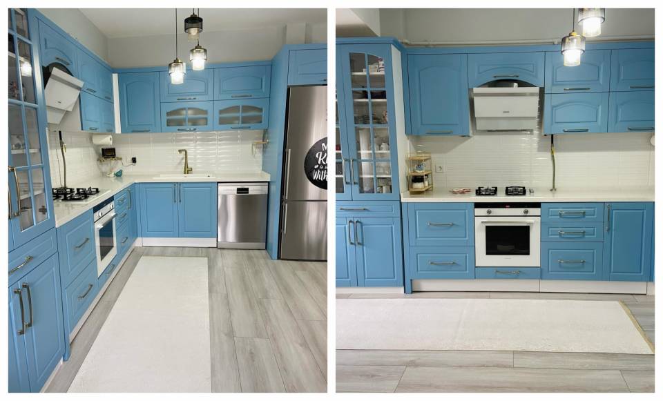 Yarım çıta uygulanan mutfakta üst kısımlarda çizgi desenli duvar kağıdı tercih edilmiş. Antreye açılan kapı dışında yarım servis penceresi de düşünülmüş!