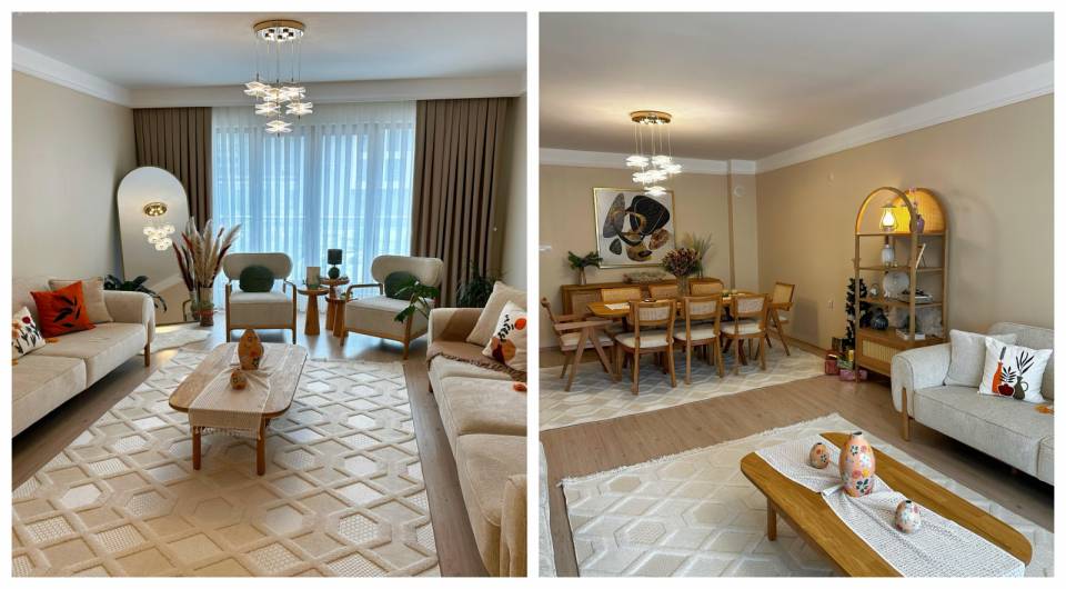 Salon, Modern, Beyaz, Kahverengi, Krem, Turuncu, Koltuk takımı, Berjer, Orta sehpa, Sehpa, Halı, Salon halısı, Tv ünitesi, Tv ünitesi aksesuarları, Ev Aksesuar, Dekoratif Objeler, Fon perde, Perde, Tül perde, Parke, Özel yapım dolaplar, Dolap