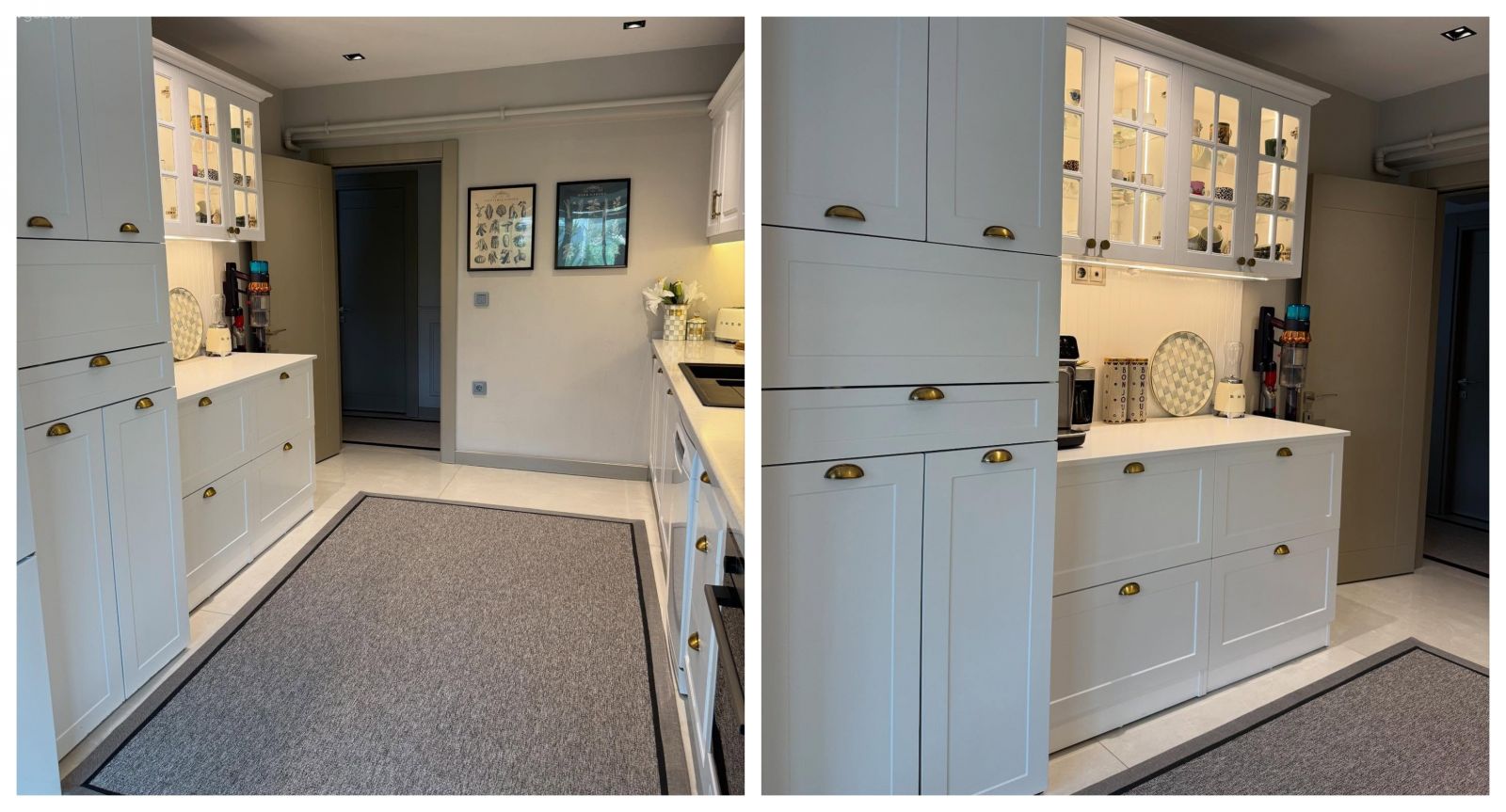 Bir taraftaki dolaplar daha çok hazırlık alanına uygun olmuş. Diğer taraf ise kahve köşesi ve kiler olarak düşünülmüş.