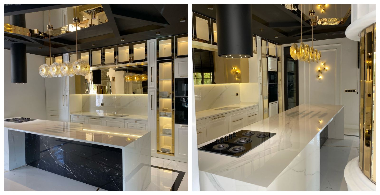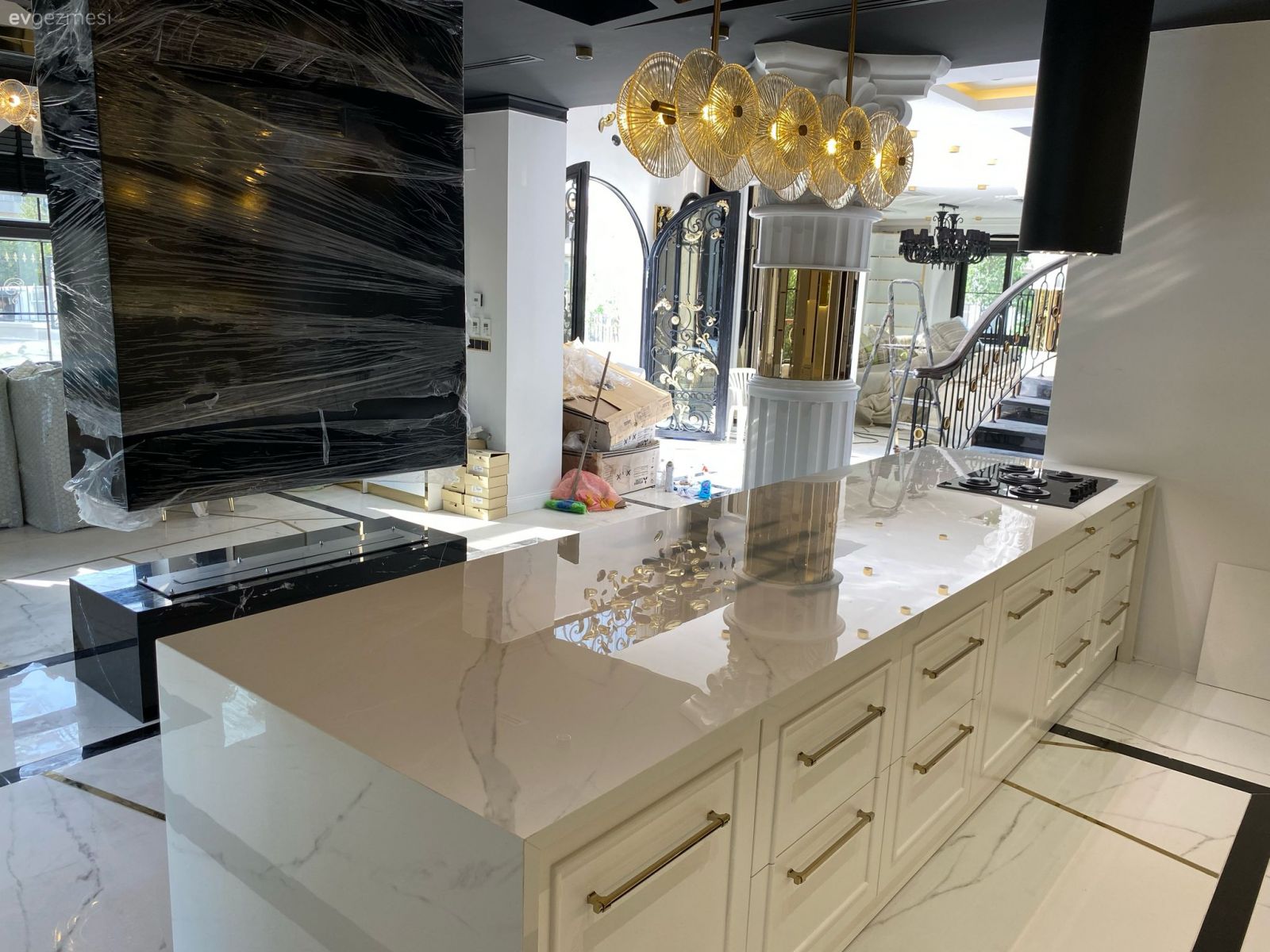 Mermerin lüks hissini de içine alan mutfakta, keskin hatlar ile birlikte art dekonun sevdiği her şey yer almış.