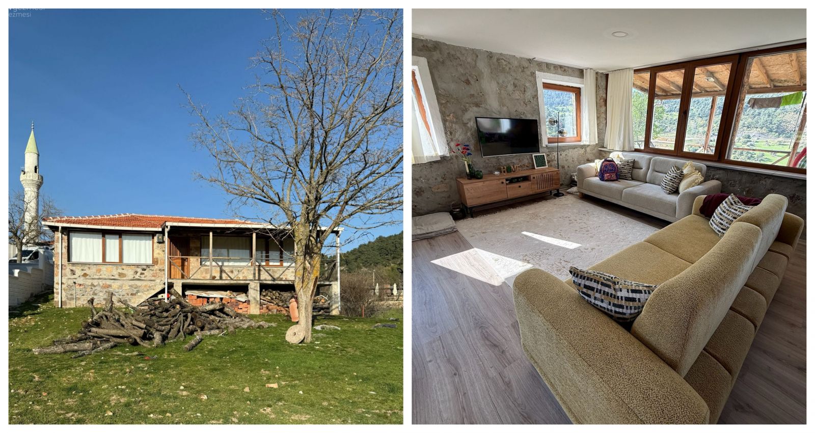 Köy evi, Krem, Sarı, Bej, Beyaz, Koltuk takımı, Halı, Tv ünitesi, Taş ev, Tül perde, Perde, Kırlent, Ev tekstili, Parke, Tv ünitesi aksesuarları, Ev Aksesuar